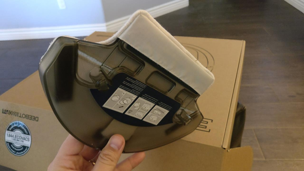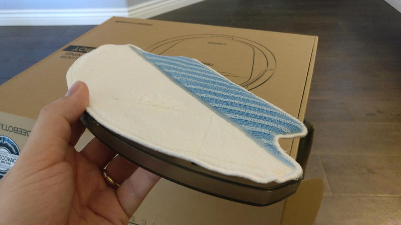 One feature that the Deebot M80 Pro has that the Roomba doesn’t have is the mop function. It comes with a reservoir part that you can fill up with water (and cleaning solution) and there is a mop pad that fits around it on one side. You snap this part to the back side of the bottom of the Deebot and have it run as normal.