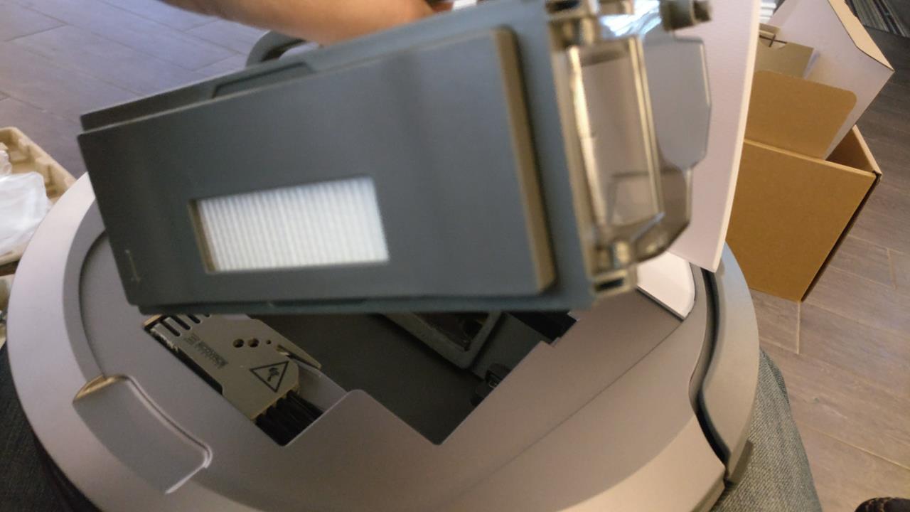 The dust collection bin on the Deebot is actually a pretty good design. Unlike the Roomba where you pull the bin off the back of it, the Deebot has the dust bin under a lid on the top. Just lift the lid, then pull the handle to get the dust bin out.