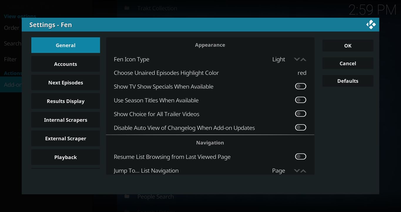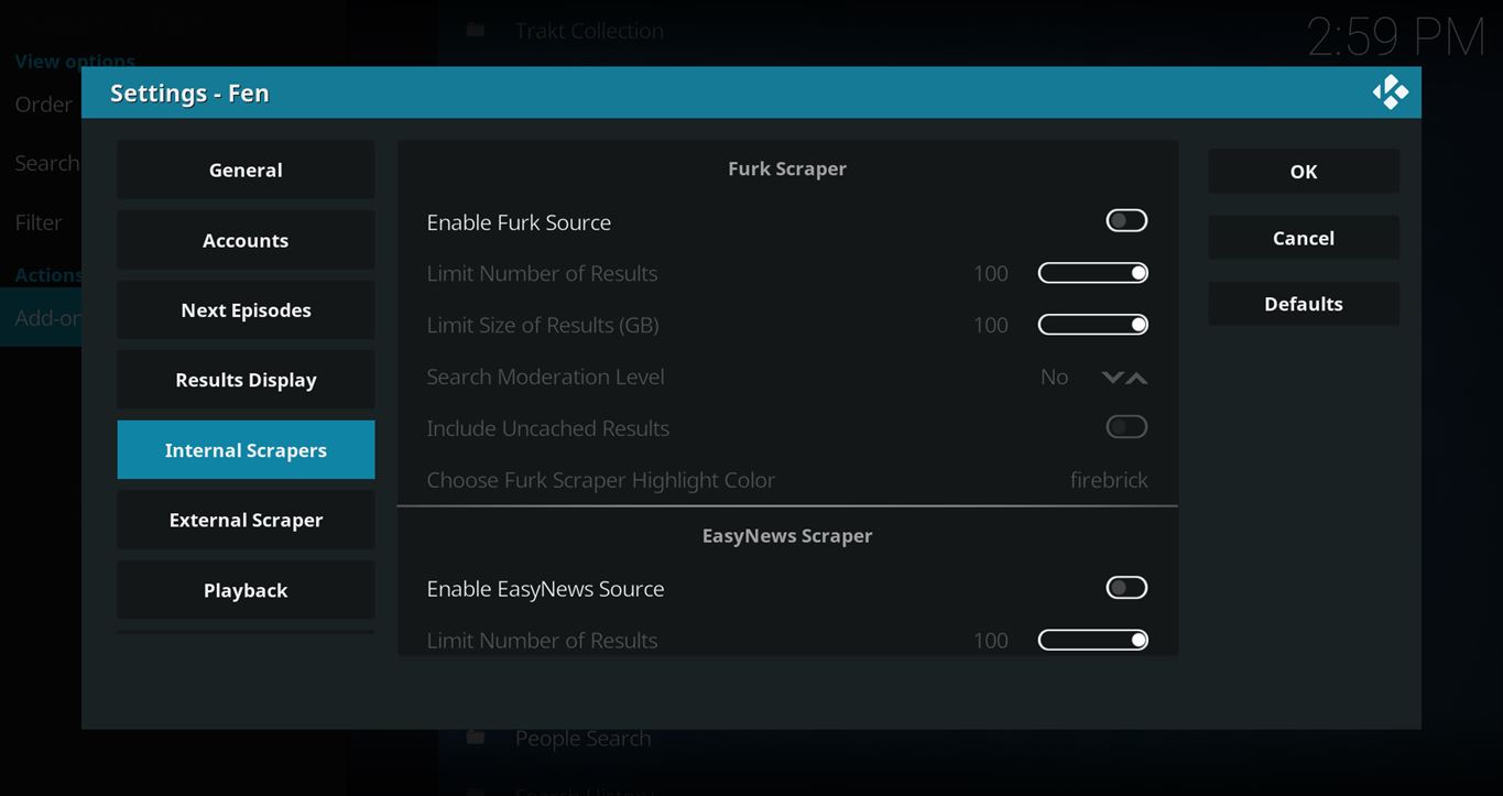 In addition to the usual external scrapers utilizing free hosters, Debrid, and torrents, Fen also has a section for “Internal Scrapers” which contains Furk Scraper, EasyNews (Usenet) Scraper, Premiumize Cloud Scraper, Real-Debrid Cloud Scraper, Local Scraper, and Downloads Scraper.