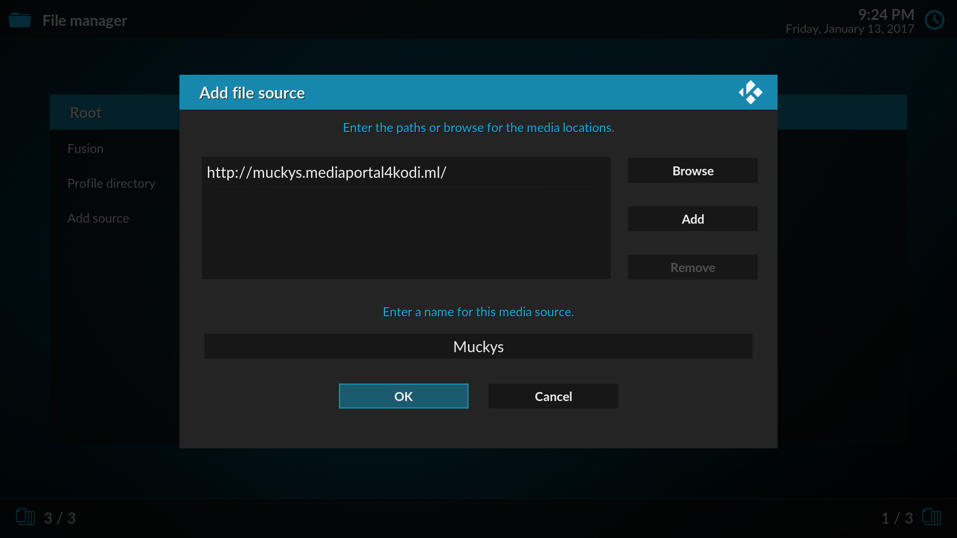 - Add a Source using the URL, http://muckys.mediaportal4kodi.ml (give it a name like “muckys”)