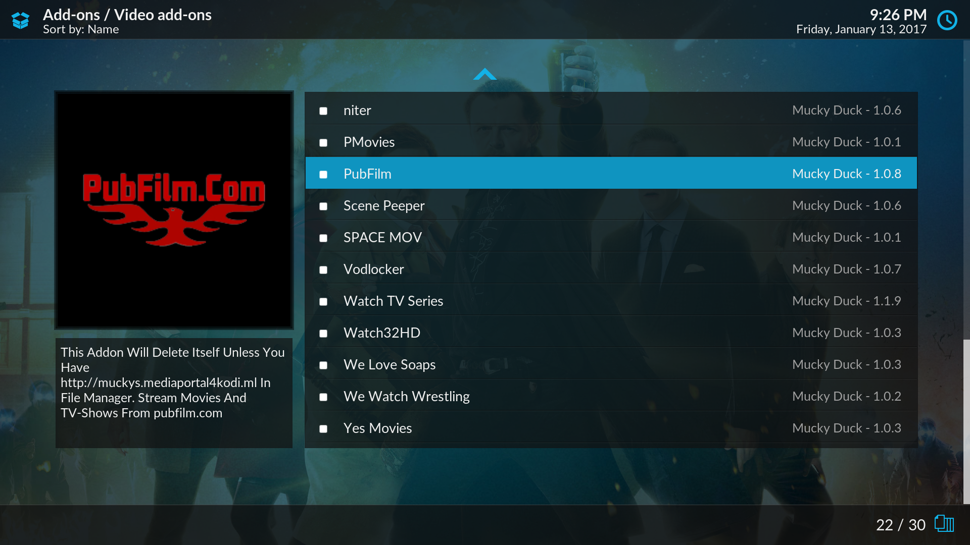 - After you see the Add-on enabled notification, select Install from Repository > Mucky Ducks Repo > Video add-ons > PubFilm > Install