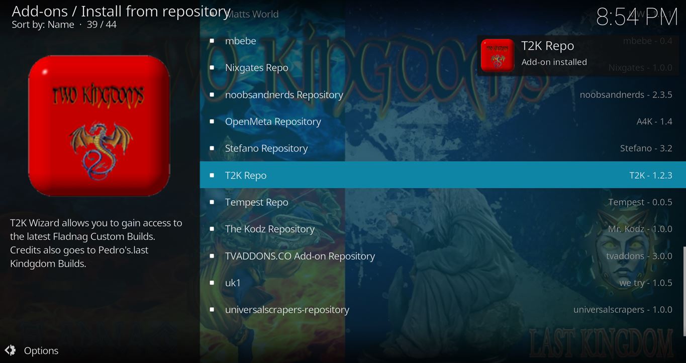 - Now, go to the Settings > Add-ons > Install from Zip File > t2k > repository.T2K-x.x.x.zip