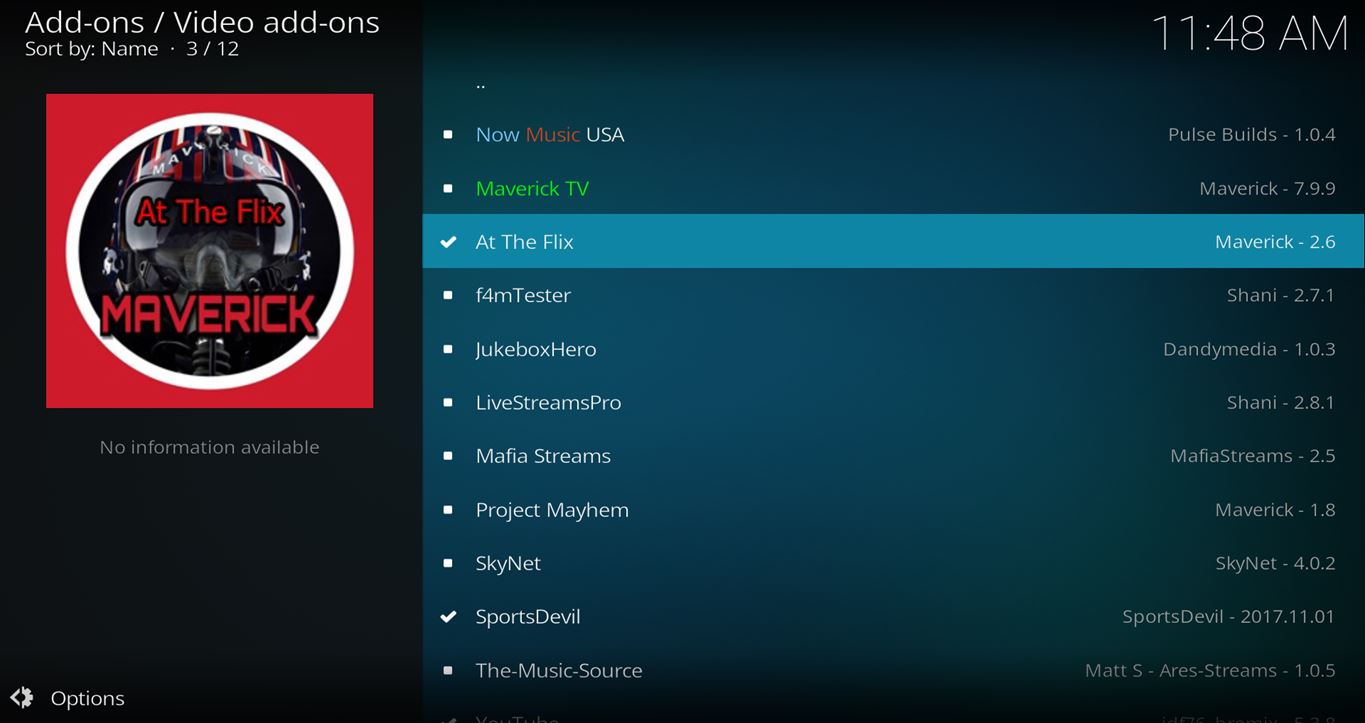 The Kodi add-on developer, Maverick, has had his Maverick TV add-on out for a while, and it seems pretty solid. It has lots of interesting finds including live TV, live sports, and lots of 24/7 channels. Maverick now has a newer add-on called “At The Flix” which claims to have “the latest movies and shows”.