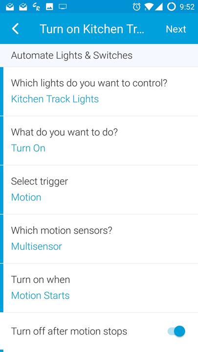 - Tap “More options” to set the illuminance condition, selecting your multisensor and choosing your light threshold number