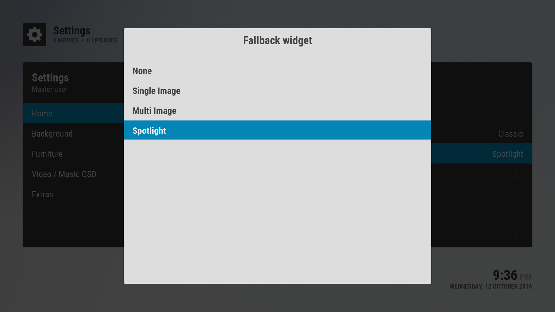Now let’s configure the home screen fallback widget. When in Skin Settings, go to Home and select Fallback Widget. Even if it’s already set to Spotlight, select it again. Choose Spotlight in the popup.