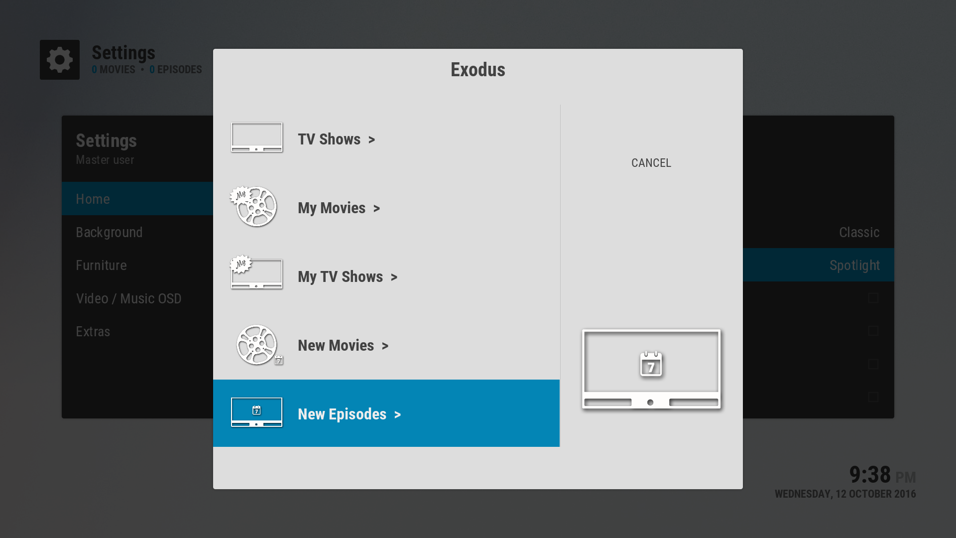We’ll use the New Episodes page in Exodus which gets the most recently aired episodes from your favorite TV shows as configured by your Trakt.tv account.