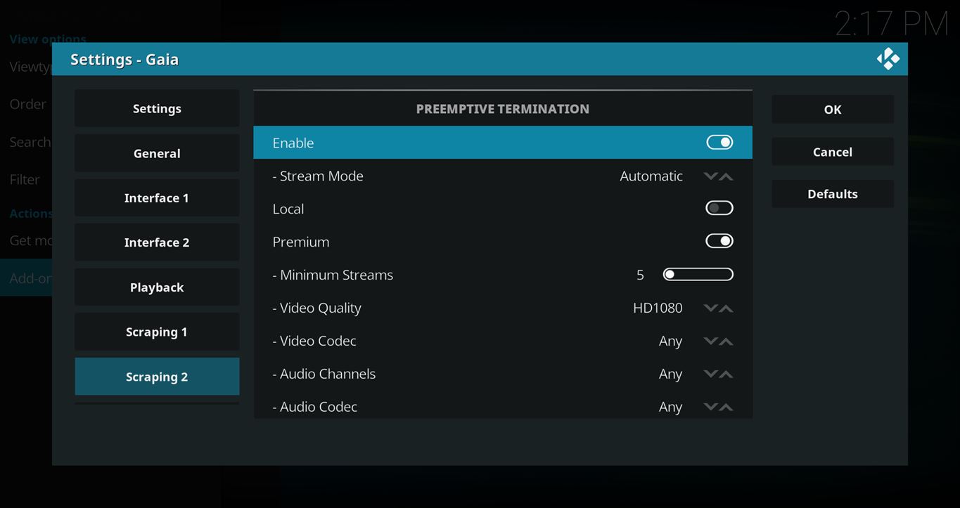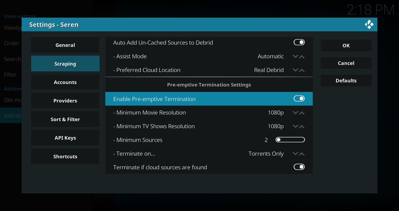 You might also notice that the default Pre-emptive Limit numbers are much lower on Seren and Gaia because those add-ons only work with debrid services like Real-Debrid or Premiumize.