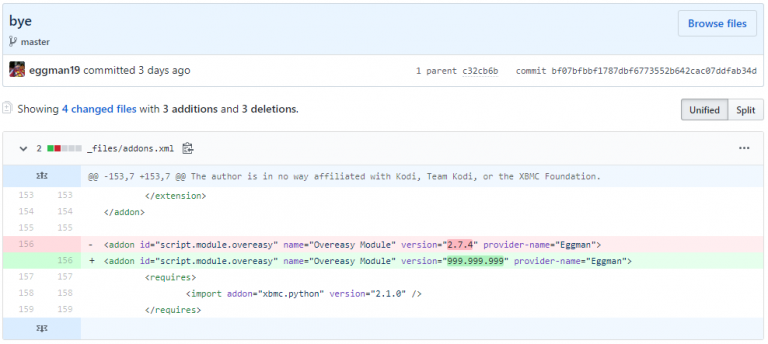 Also, on the same day, June 19th, eggman19 pushed a “bye” commit to his repo removing the OverEasy add-on functionality for all Kodi installs with this add-on installed and automatic updates enabled.